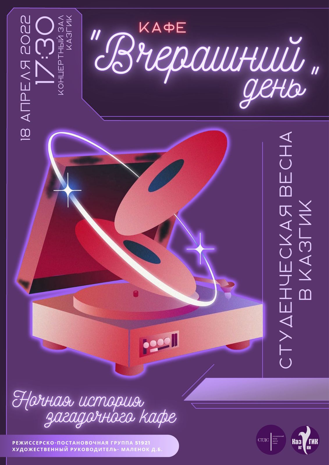 18 апреля в стенах Казанского государственного института культуры прошел ежегодный студенческий фестиваль «Студенческая весна». В этом году наш ВУЗ представил свою новую программу - «Кафе «Вчерашний день». Тематика театрализованного действа повествует о загадочной истории ночного кафе, куда попадает главный герой- студент Артём, где с ним происходят события, которые заставляют по другому посмотреть на свои поступки .