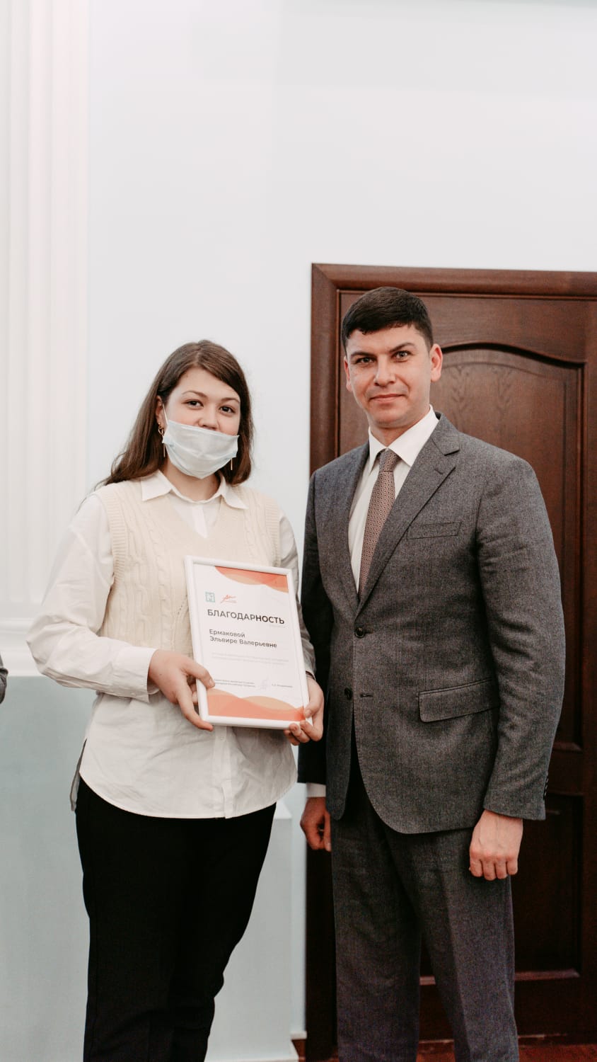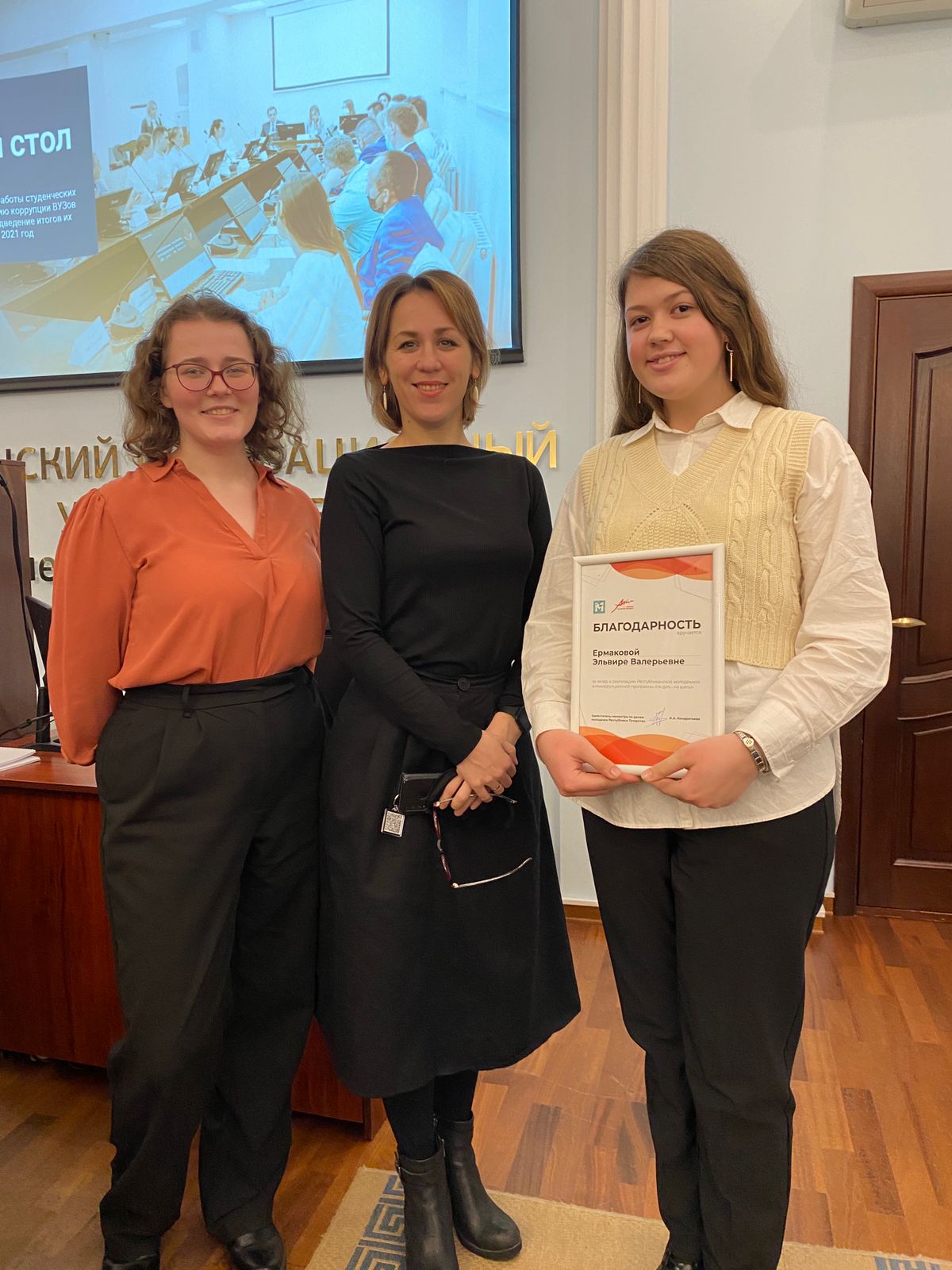 Член студенческой антикоррупционной комиссии Казанского государственного института культуры Эльвира Ермакова была отмечена благодарственным письмом Министерства по делам молодежи Республики Татарстан и Региональной общественной организации "Академия творческой молодёжи Республики Татарстан" за вклад в реализацию молодежной антикоррупционной программы "Не дать - Не взять!".