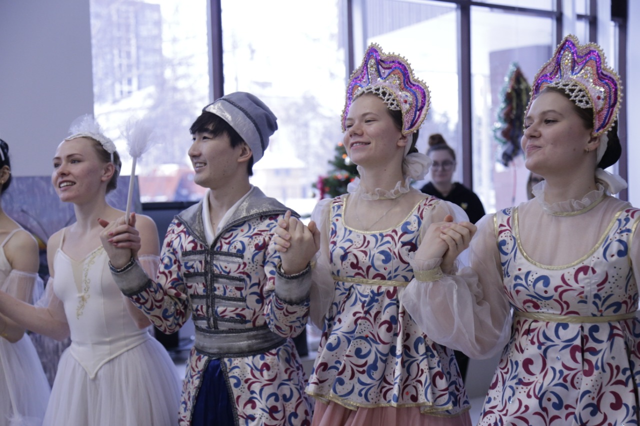 Долгожданная встреча с Новогодним волшебником и Снегурочкой, пушистыми лесными зверями и инопланетянами, конкурсы и танцы была организована студентами института.
